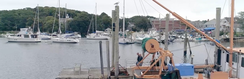 A still from "Earth, a Living Body" shows MBL Whitman scientists Jack Costello and Sean Colin preparing to sample off the MBL dock.