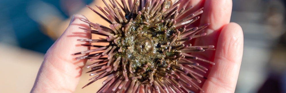 With their long spines to deter predators, sea urchins are known as the porcupines of the sea. (The name sea urchin comes from the Old English term for spiny hedgehog.) The dark-purple body of the purple sea urchin (Arbacia punctulate), called a test, is made up of ten fused plates that encircle the urchin. Each of these fused plates has small holes through which the feet extend. These feet are controlled by an internal vascular system. The urchin moves along the seafloor by pumping water into and out of the tube feet, which regulates if the feet are extended or contracted. Sea urchins eggs have been important for studying embryological development since the nineteenth century.